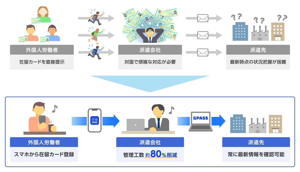 従来GPASSには、外国人労働者本人がスマートフォンで在留カードのICチップを読み取り本人確認を行う機能や、在留資格の失効情報の自動照会、更新期限前のプッシュ通知、APIによる外部連携機能が備わっています。今回のグループ管理機能と組み合わせることで、派遣の例では外国人労働者の在留資格情報を受入企業にもオンタイムに自動連携し、不法就労に当たらないことを証明できるようになります。