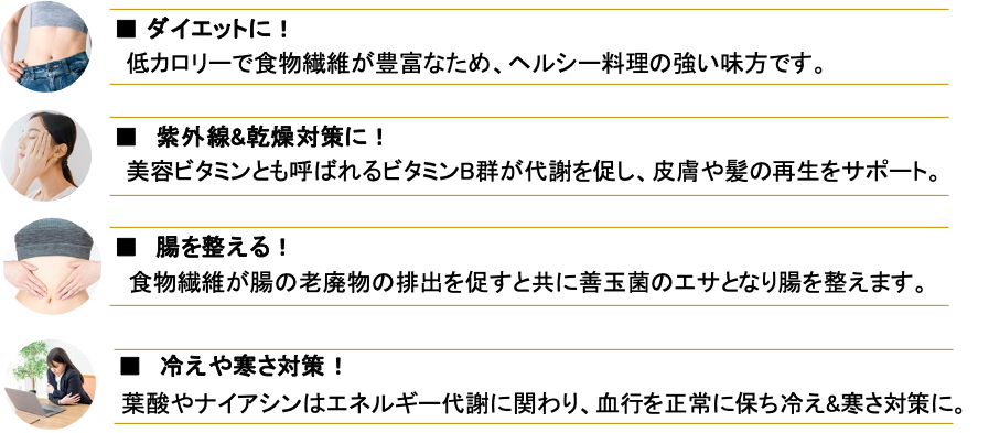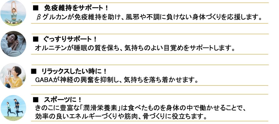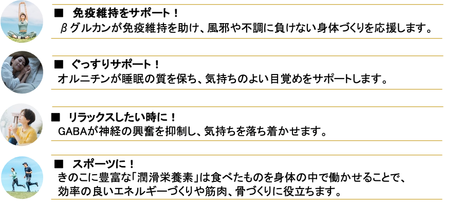 で健康になる生活習慣「きのこで菌活」を実践することで、体に嬉しい様々な効果効能があります。