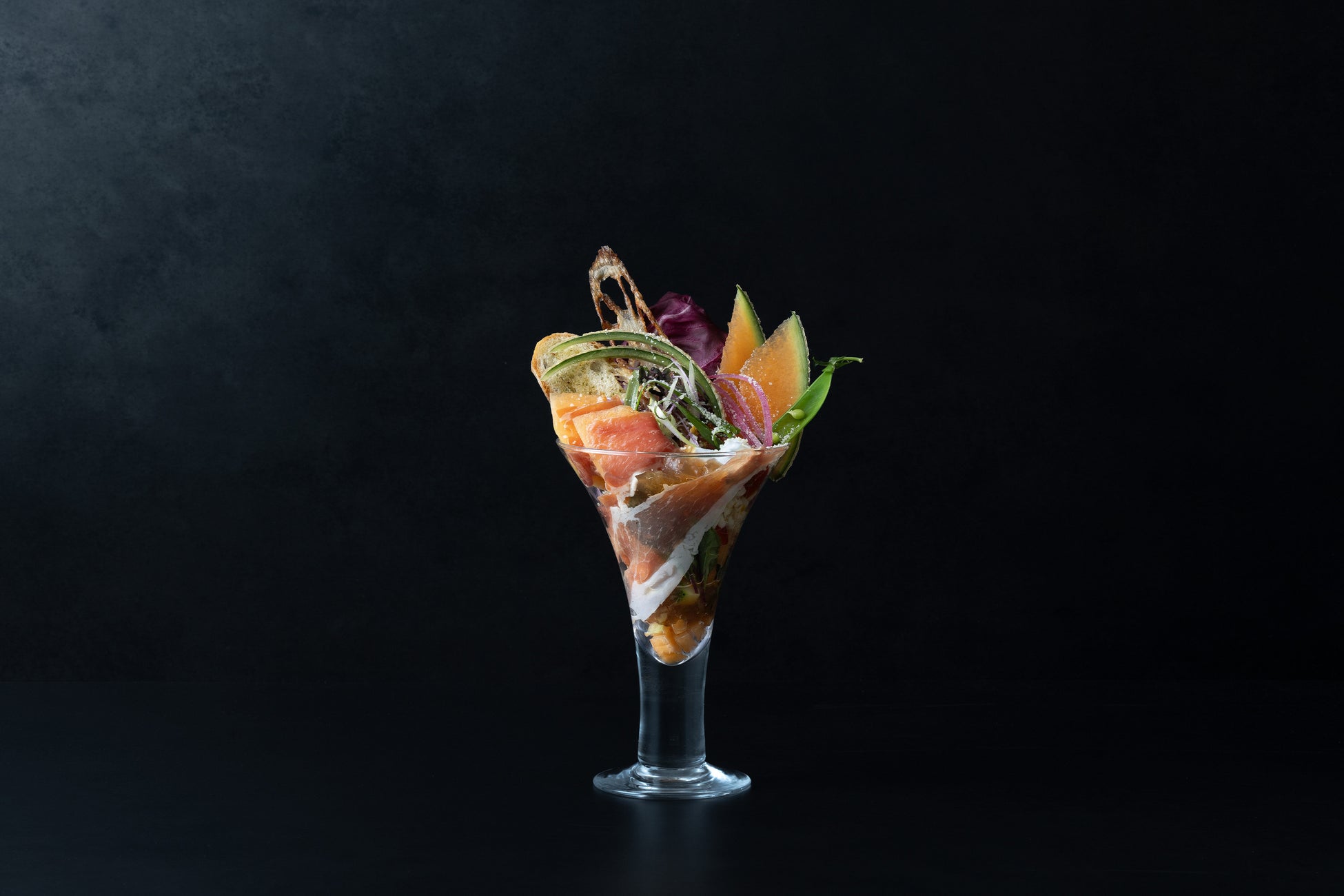 甘み豊かなメロンと、塩気のきいた生ハムの絶妙な組み合わせを、イタリア伝統のショートパスタ「トロフィエ」とともに。メロンのラタトゥユ、バルサミコやアンチョビ、コンソメジュレ、ストラッチャテッラチーズ、彩り野菜を合わせ、冷製仕立てにした‟食べるデリパフェ”です。