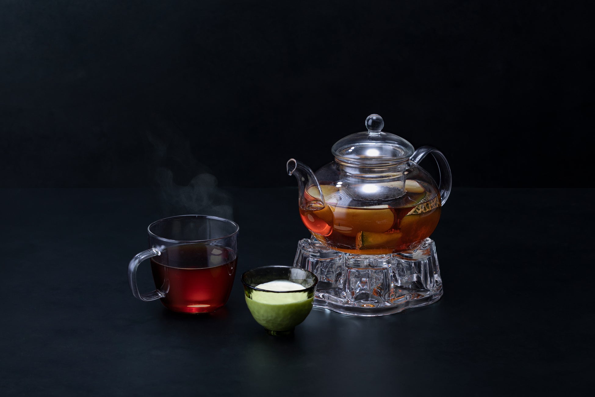生メロンを贅沢に使った、あたたかいメロンティーです。メロンのフレーバーを引き立てる、りんごと桃も使用しています。途中で、特製メロンチーズクリームを加えると、クリーミーに変化。紅茶を飲み終わった後の果実も是非お召し上がりください。