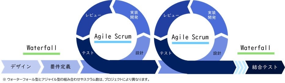 ウォーターフォール型の要件定義に基づき計画性を担保することで予算管理の課題を解消しつつ、アジャイル型の特長のひとつであるアジャイル・スクラム等の導入により、要件の追加・変更に柔軟に対応可能なシステム開発を支援します。