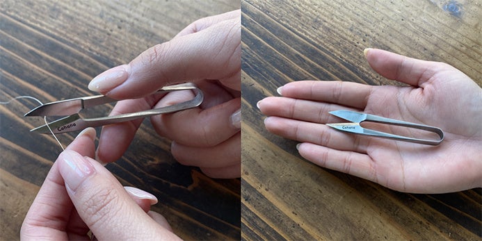 その地でにぎりばさみをつくり続けて60年の職人、かね貞さんが一丁ずつ磨きあげた、切れ味抜群の全長75ミリの小さな糸切ばさみです。
