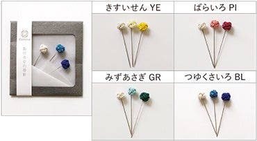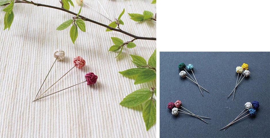 長野県に古くから受け継がれている飯田水引で、あわじ玉がモチーフの待針をつくりました。