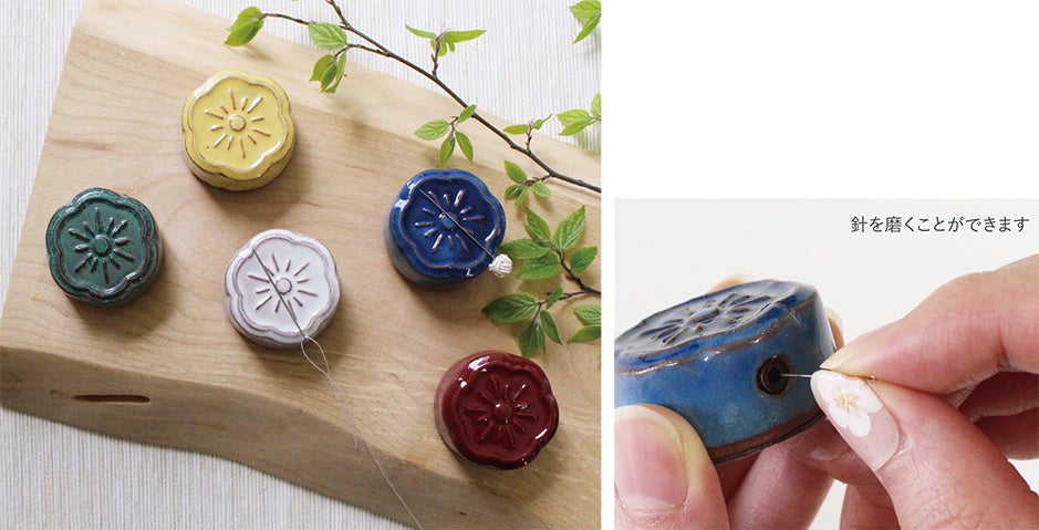 釉薬をかけて焼き上げる「陶器瓦」は、表情にちがいが出てそれぞれに個性が光ります。針やすめの中にはマグネットが入っており、お花の上に針を置いておくことができます。針を磨くときは、側面の穴に針先からゆっくり差し込み、底の部分を押しながら磨くと、布通りがよくなります。かわいい針やすめが手仕事の時間に花を添えてくれます。