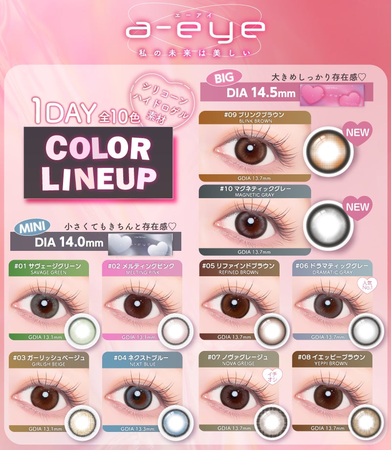 a-eyeは「私の未来は美しい」をコンセプトに、「最上級グレードの瞳」と「AI級ビジュアル」を叶えるカラーコンタクトレンズブランドです。かわいくなれることはもちろん、瞳への優しさ、快適さを両立したシリコーンハイドロゲル素材を採用しています。