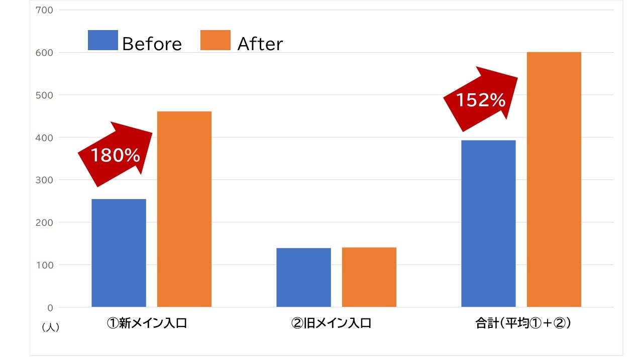 ビーツでは新しくメイン入口となる入口にデジタルサイネージを設置した他、開放的な空間創りを実施しました。改装実施前後にAIカメラを用いて、2つある入口の人流(来店客数)測定を行い、新メイン入口側に改装前比で約1.8倍の来店客が流入し、期待した効果が出ていることを確認しました。また、改装後6か月経過後の定点観測においても同様の効果が継続していることを確認しております。