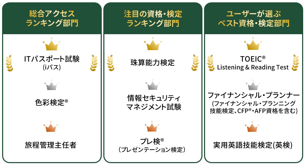 今年で6回目の開催となる「日本の資格・検定」AWARDSは、アクセス数やユーザーへのアンケート結果など定量的な数値を基にユーザーが注目・支持している資格・検定を決定。この 「日本の資格・検定」AWARDSの発表には、世の中に資格・検定を広く認知していただくだけではなく、第三者からの評価により資格・検定自体の付加価値をさらに高めたいという思いが込められています。