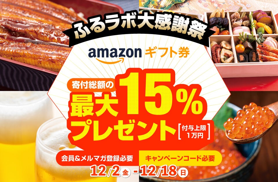 「ふるラボ」で今年最大級のキャンペーン開催中!寄付額の最大15%のAmazonギフト券をプレゼント!ふるさと納税するならお得ないま!