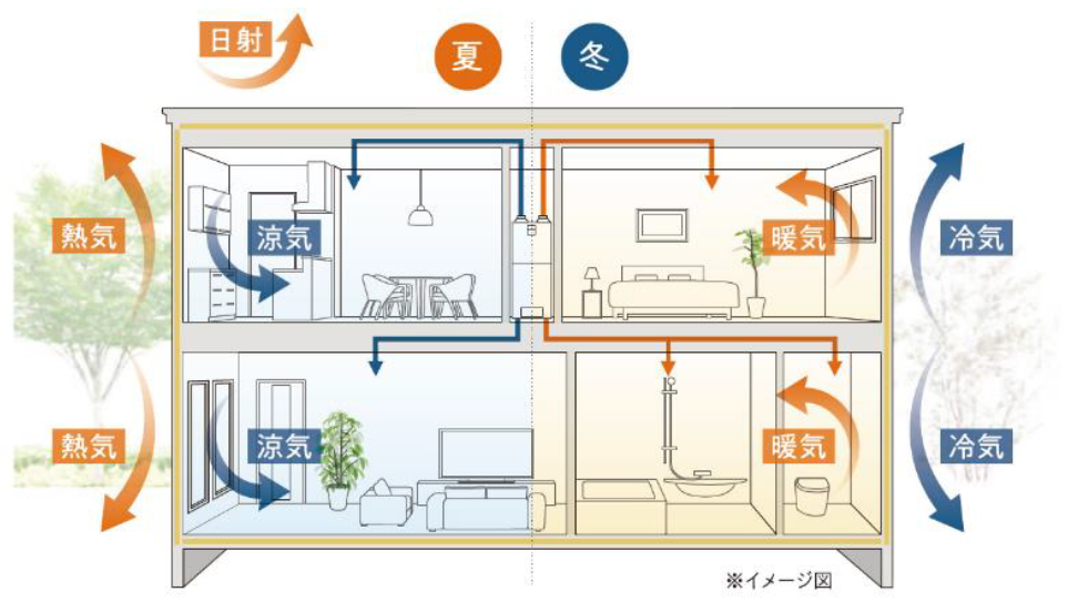 標準仕様:全100プランがZEHの断熱基準(Ⅲ地域以南)をクリア。EPS断熱材や、アルミサッシの約3倍の断熱効果を持つ高性能樹脂サッシの採用などにより、夏は冷房で冷やした空気を、冬は暖房で暖めた熱を外に逃がしません。さらに、熱交換効率90%(冬期)の「全館換気システム ロスガード90」が、家中どこでも心地よく新鮮な空気環境を実現します。