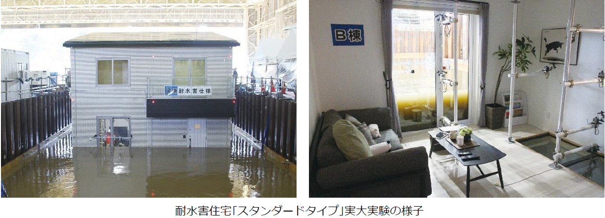 一般的な仕様の住宅において、床下・床上浸水すると考えられる箇所は複数存在します。当社はこれらを危険ポイントと定め、「浸水」「逆流」「水没」「浮力」の4つに分類。建物本体だけでなくサッシ等の開口部の水密性の向上、水の浸入・逆流を防ぐ特殊弁の採用などの対策を施しました。また、外部の電気設備は、その本体や稼働に関わる部品を水没から免れる高さに設置することで、水害後も電気や給水・給湯などのライフラインを確保しています。そして、耐水害住宅「スタンダードタイプ」には、一定の水位に達した際に、「床下注水ダクト」で水をあえて床下に入れて重りにして浮上を防ぐ、浮力対策が施されています。