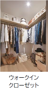 標準仕様:大容量の「ウォークインクローゼット」や各居室の「クローゼット」、ベビーカーや防災用品も十分に収納できる「シューズクローク」を備えています。(プランにより異なります)