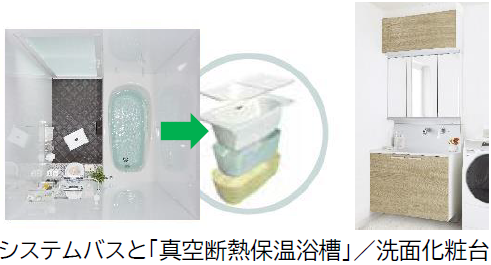 標準仕様:追い焚きなしで6時間経っても約1℃しか湯温が下がらない(※2)「真空断熱保温浴槽」を備えた「システムバス」や多彩な機能と収納力を備えた「洗面化粧台」を完備。
