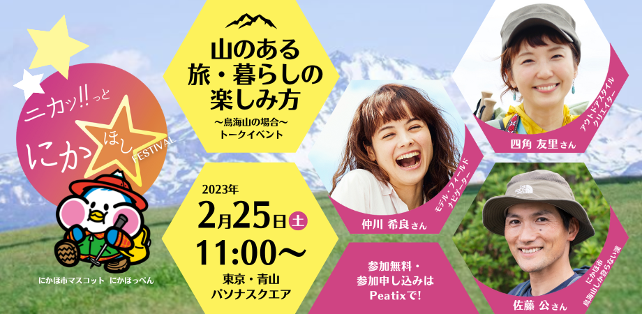 秋田県にかほ市(市長・市川 雄次)は、2023年2月25日(土)に東京・青山にてイベント「ニカッ!っとにかほしフェスティバル」を開催します。鳥海山の魅力を紹介するトークショー、地元企業登壇によるトークセッション、大学生インターンたちが独自に取材・企画したコンテンツなどを予定しており、東京にいながら同市の魅力を体感することができ、さらにまちとの繋がりを持ち帰ることができる1日限定のリアルイベントです。