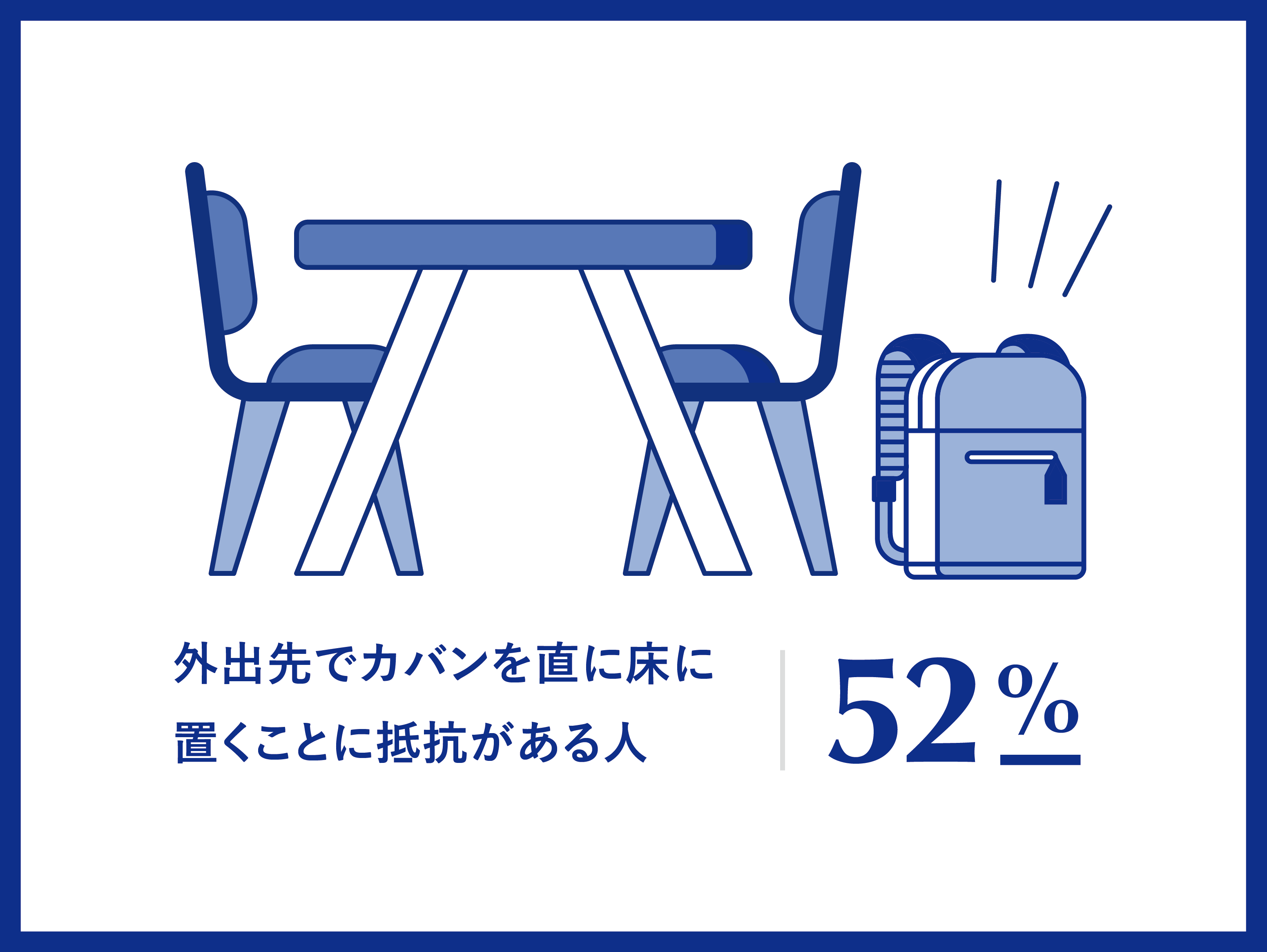 また、今回もう一つ着目したのが「コロナ禍で敏感になった衛生面」での課題です。増えた持ち物の中に除菌グッズや感染症対策グッズが入ったほか「外出先でカバンを直に床に置くことに抵抗がある人」が約5割いることが分かりました。