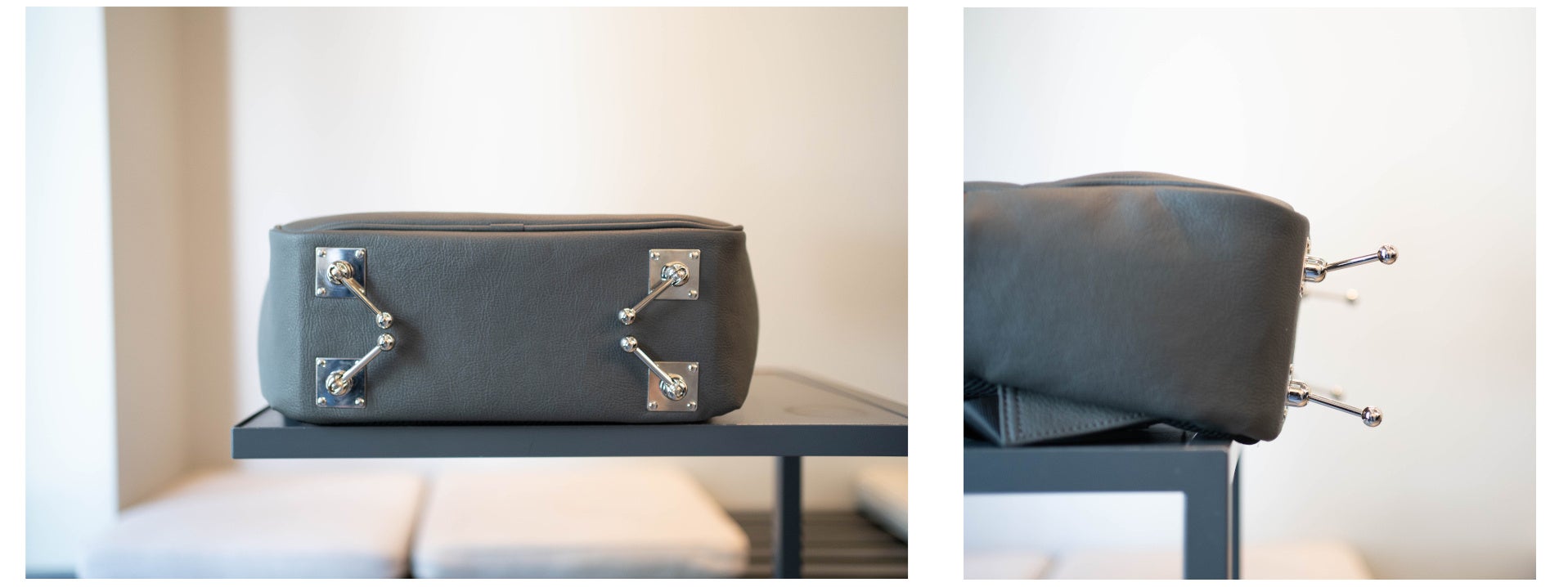 バックパックの底に4つの脚がついており、外でも底が地面に直接触れません。PCの重さにも耐え自立する清潔感×自立性を兼ね備えた脚です。