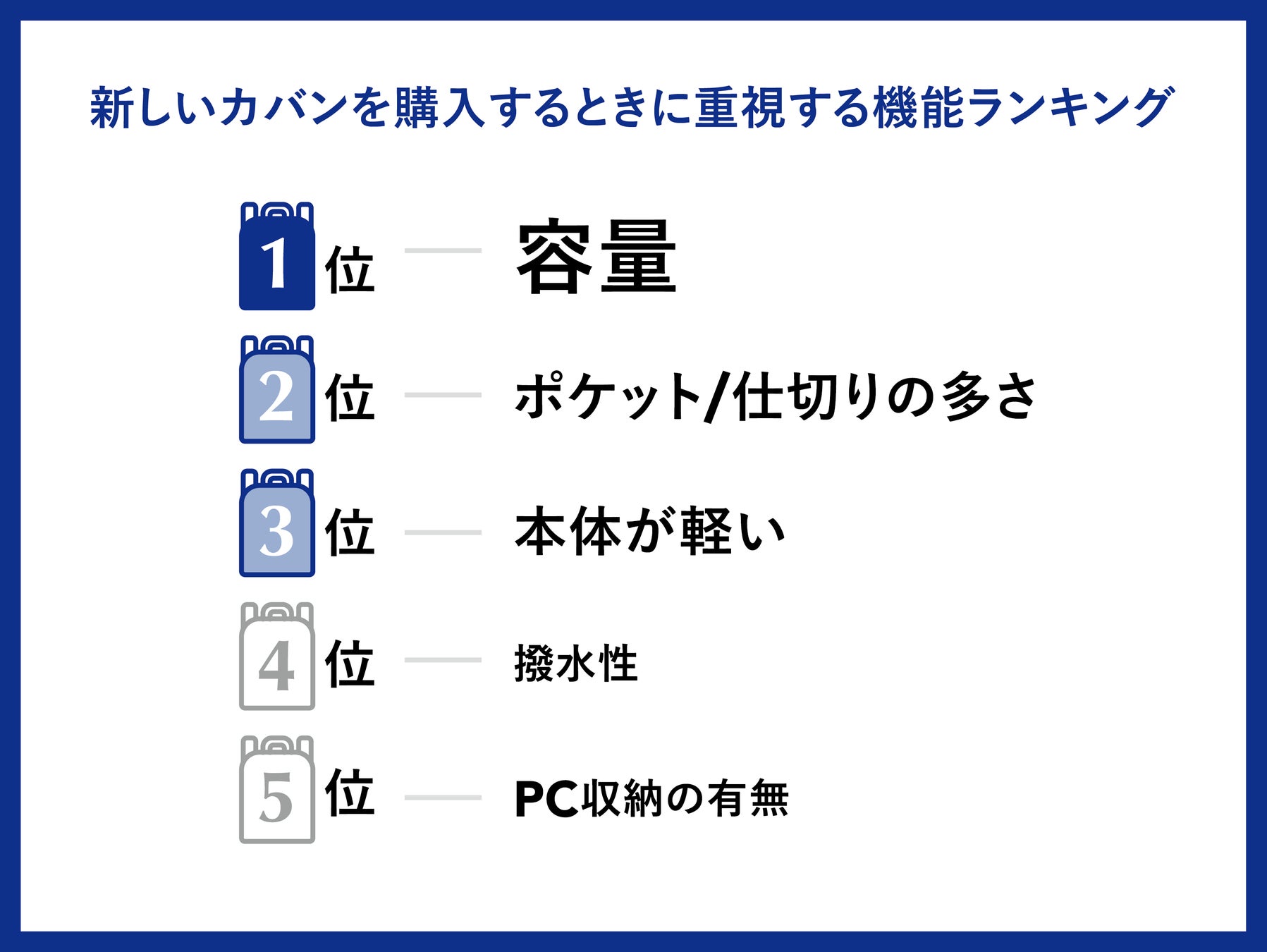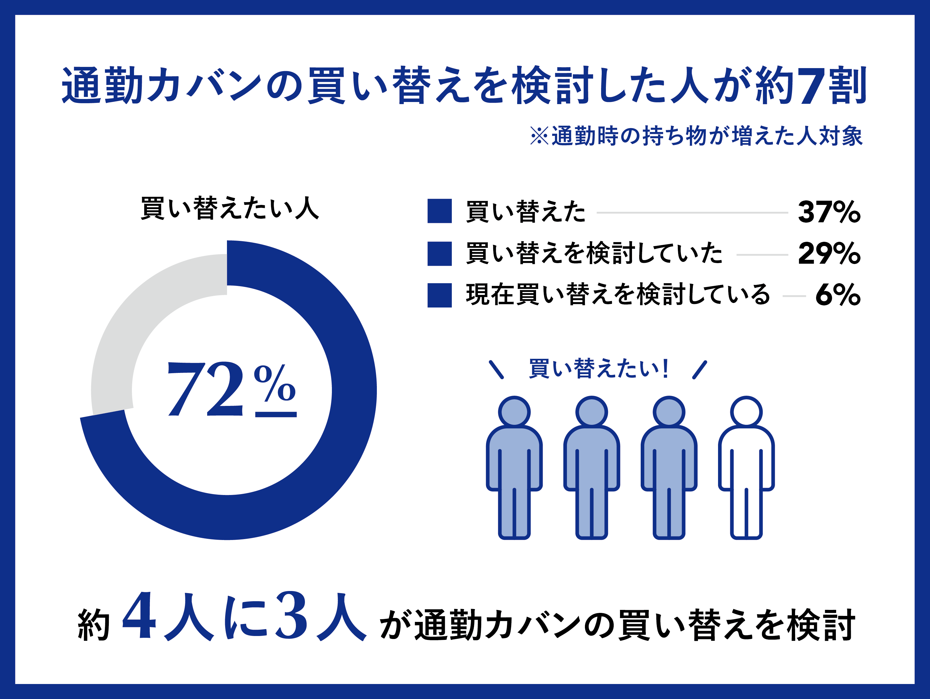 通勤時の持ち物が増えた人のうち、約7割の人が「通勤カバンの買い替えを検討した」と回答しました。さらに、新しいカバンを購入するときに最も重視するのは「容量」「ポケット/仕切りの多さ」「PC収納の有無」など、機能面の特徴であることが分かりました。