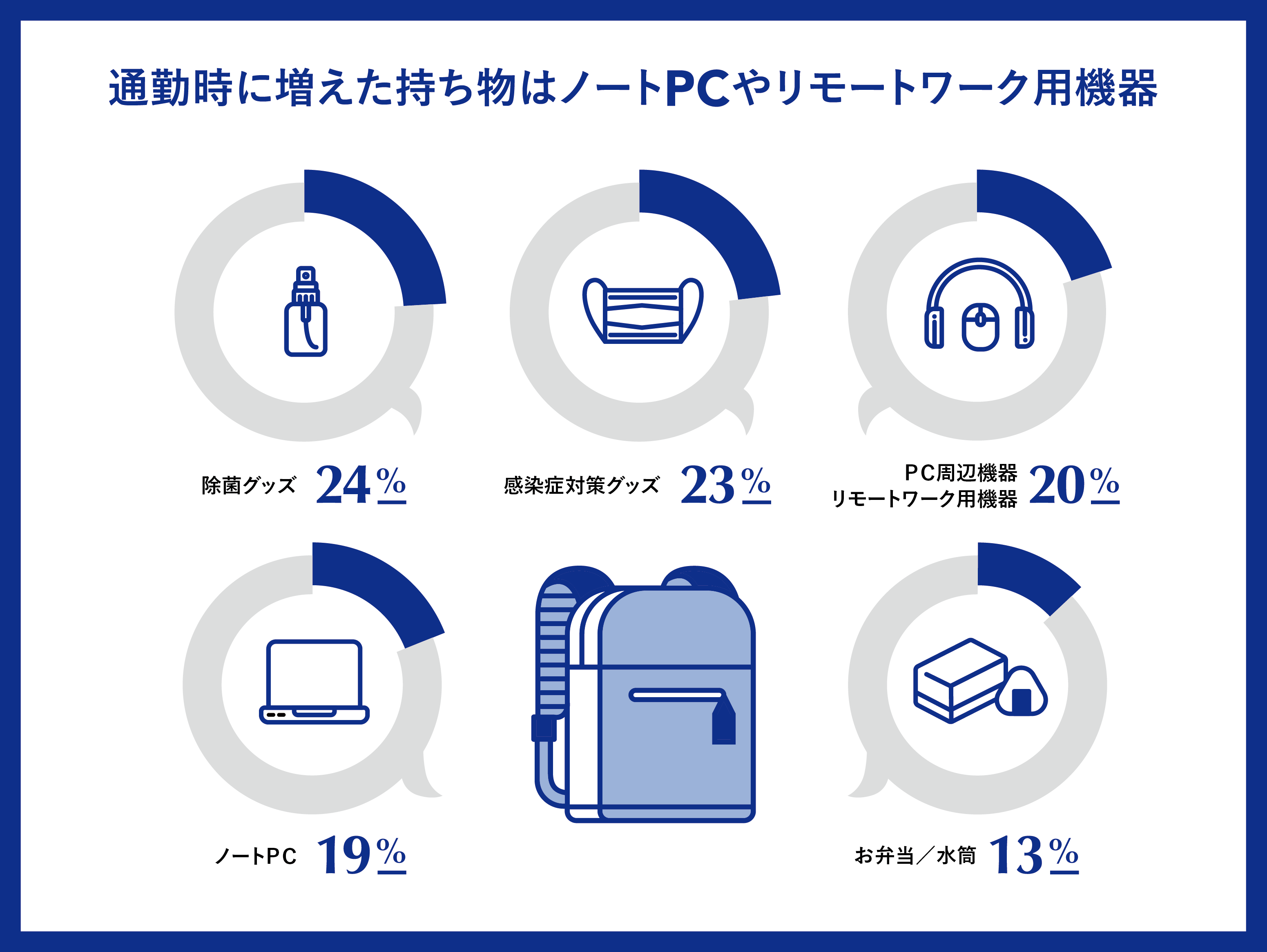 増えた持ち物として多くあがったのは、ノートPCやPC周辺機器などリモートワーク用の荷物です。