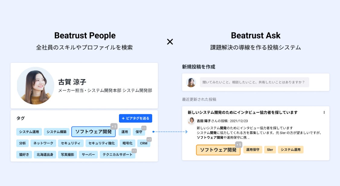 Beatrustは組織内における従業員同士の自律的な協業を促進し「タレントコラボレーション」を実現するプラットフォームです。現在 Beatrust People、Beatrust Ask という2つの機能を中心に展開されています。