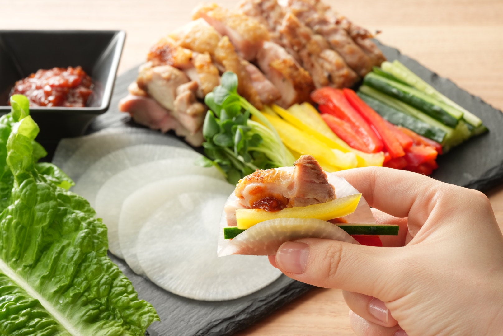 華味鳥のうま味と、コク深いサムジャンを新鮮な野菜で包んで、お召し上がりください。小鉢やチャプチェと一緒に包んでも、思わず笑顔になる美味しさです!