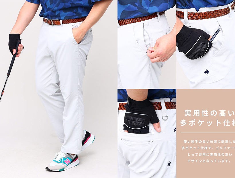 ポロシャツ、ブルゾンは2L~5L、ボトムスはウエスト100~120㎝までと幅広く対応し、人気のアイテムを取り揃えました。トップスは、ルミエール柄や総柄、無地などを展開するほか、パンツはストレッチの性の高い素材を使用した9分丈をご用意。脚の曲げ伸ばしもスムーズでしゃがんだり立ち上がったりする機会の多いゴルフ中でも楽な履き心地を叶えてくれます。また、スッキリしたデザインなのでゴルフだけでなく普段使いとしてもご利用可能です。使い勝手の良い位置に配置した多ポケットはプレー中に使用する小物を収納できるなど、ゴルファーにとって非常に実用性の高いデザインとなっています。デザイン性・実用性を兼ね備えたゴルフウェアをぜひお試しください。