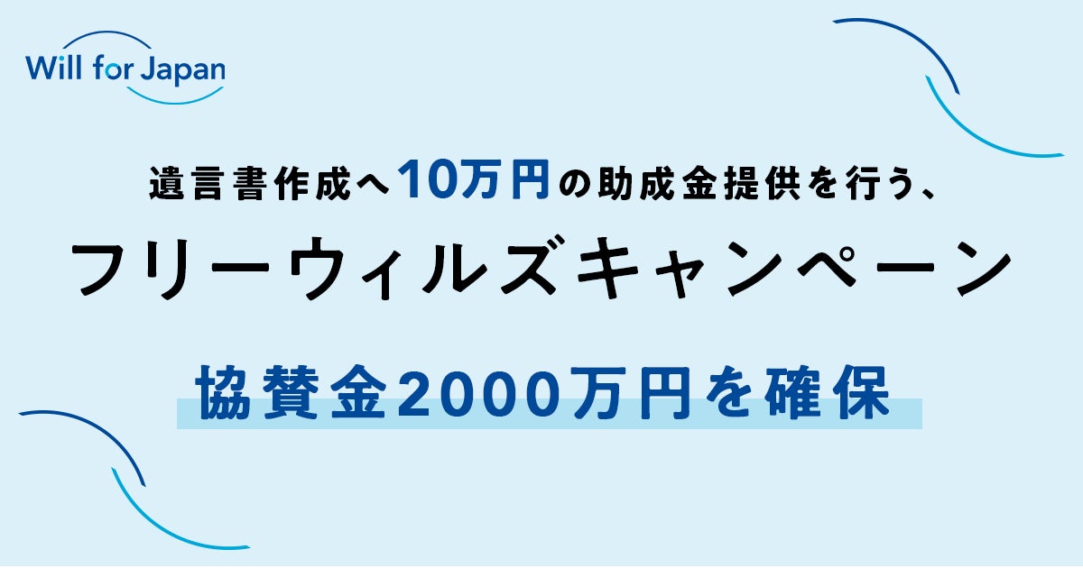 遺言書作成へ10万円の助成金提供を行う、「フリーウィルズキャンペーン2024」協賛金2000万円を確保