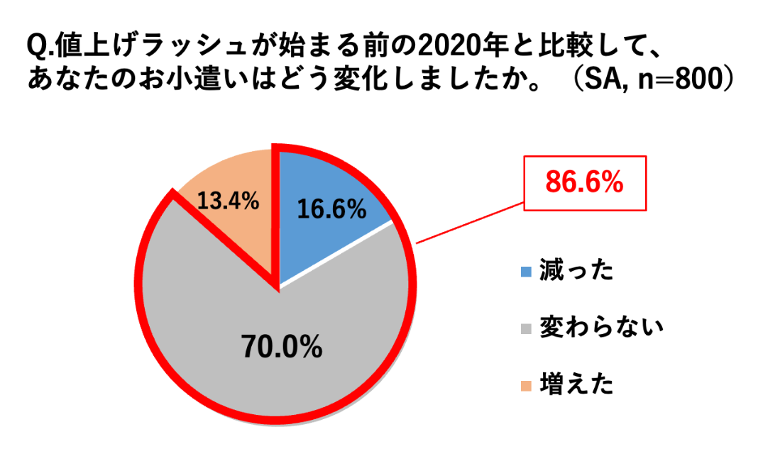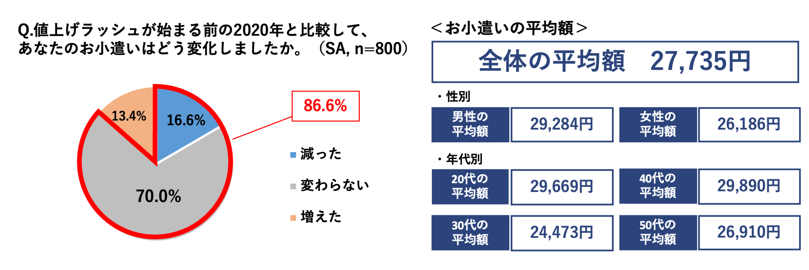 値上げラッシュが始まる前の2020年と比較して、8割以上(86.6%)の人がお小遣いが増えていないことが判明し、増えていない人のうち、「変わらない」人は70.0%、「減った」人は16.6%という結果になりました。またお小遣いの平均額は27,735円となり、約半年前に実施した前回のお小遣い調査と比較すると、18円増加(+0.06%)とほぼ変動していませんでした。