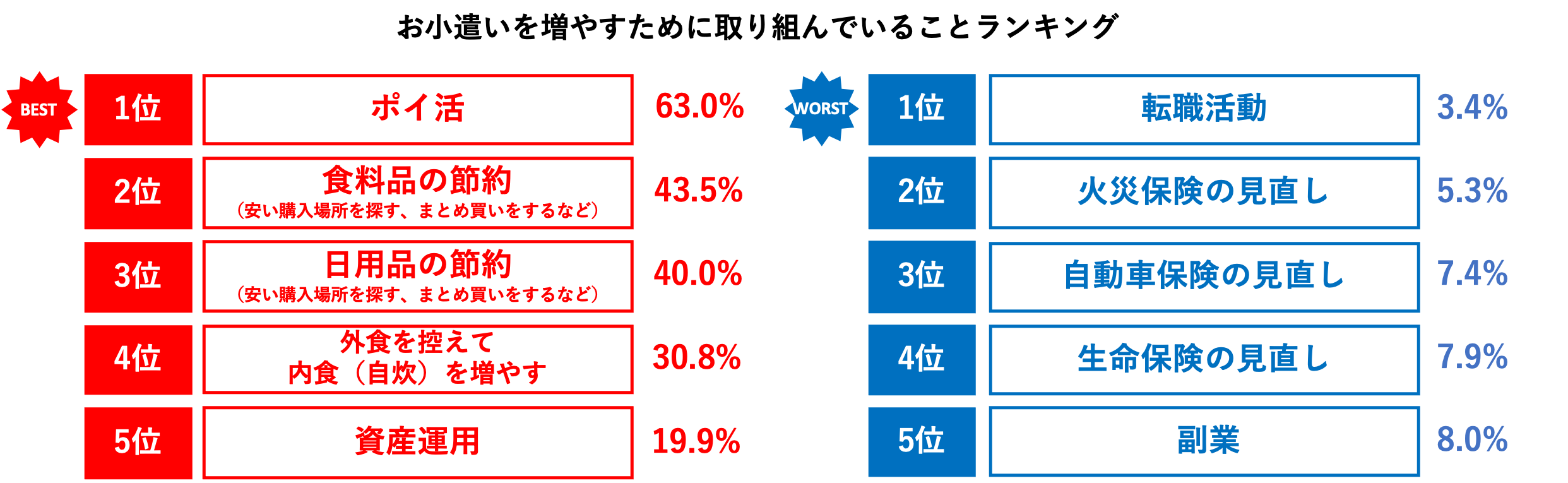 お小遣いを増やすために6割以上(63.0%)が「ポイ活」に取組んでいると回答しました。次いで「食料品の節約(43.5%)」「日用品の節約(40.0%)」「外食を控えて内食(自炊)を増やす(30.8%)」となり、日常生活の中で支出を制限し、節約をしていることがうかがえます。その一方で、各種保険などの固定費の見直しに取り組んでいる人はそれぞれ1割に満たないことが判明しました。