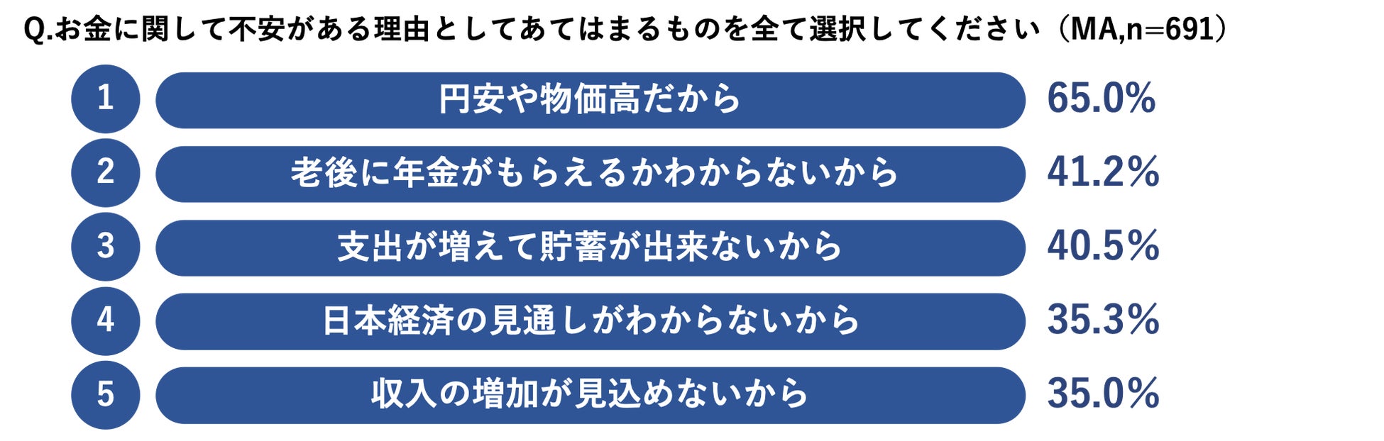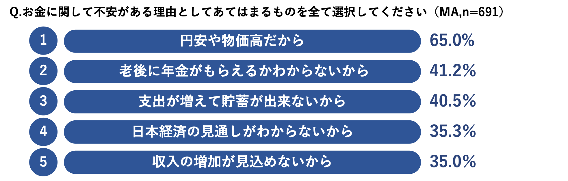 お金に対して「不安がある(50.0%)」「どちらかというと不安がある(36.4%)」と、不安を感じている人が86.4%にのぼる結果となりました。不安に感じる理由として最も多い回答が「円安や物価高だから(65.0%)」となり、次いで「老後に年金がもらえるかわからないから(41.2%)」、「支出が増えて貯蓄ができないから(40.5%)」という結果に。円安や物価の上昇は日々の生活に直結するため、多くの人々がお金に対して不安を感じていることがうかがえます。