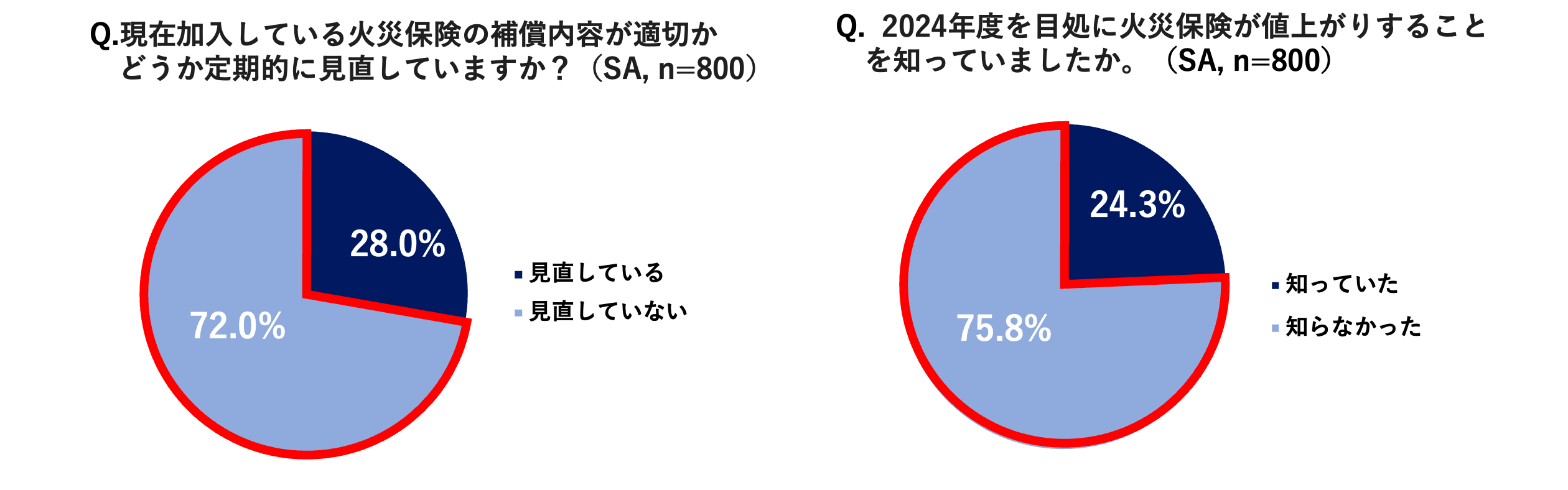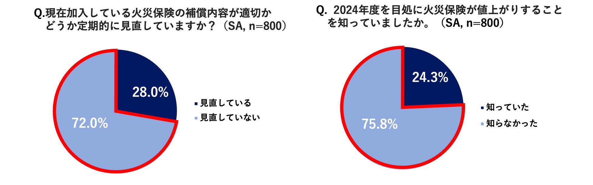 7割以上(72.0%)の人が、加入している火災保険の補償内容が適切かどうか定期的に「見直しをしていない」と回答。加えて、2024年度を目処に火災保険が値上げすることを知らない人も7割以上(75.8%)いる結果となりました。