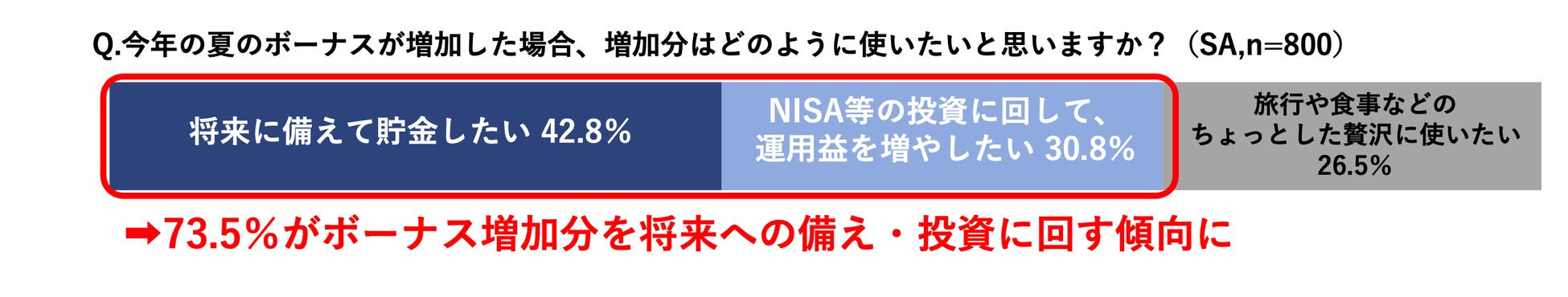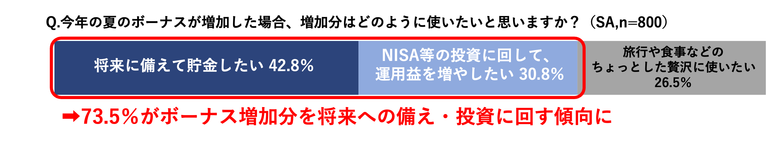 ボーナスが増加した場合、増加分を「将来に備えて貯金したい(42.8%) 」、「NISA等の投資に回して、運用益を増やしたい(30.8%)」と、ボーナスを“消費”ではなく、“将来に備える”意識が強い傾向にあることがうかがえます。円安や物価高など経済の先行きが不透明であることから、多くの人が万一の事態に備えて貯金や投資を選んでいることが推測されます。