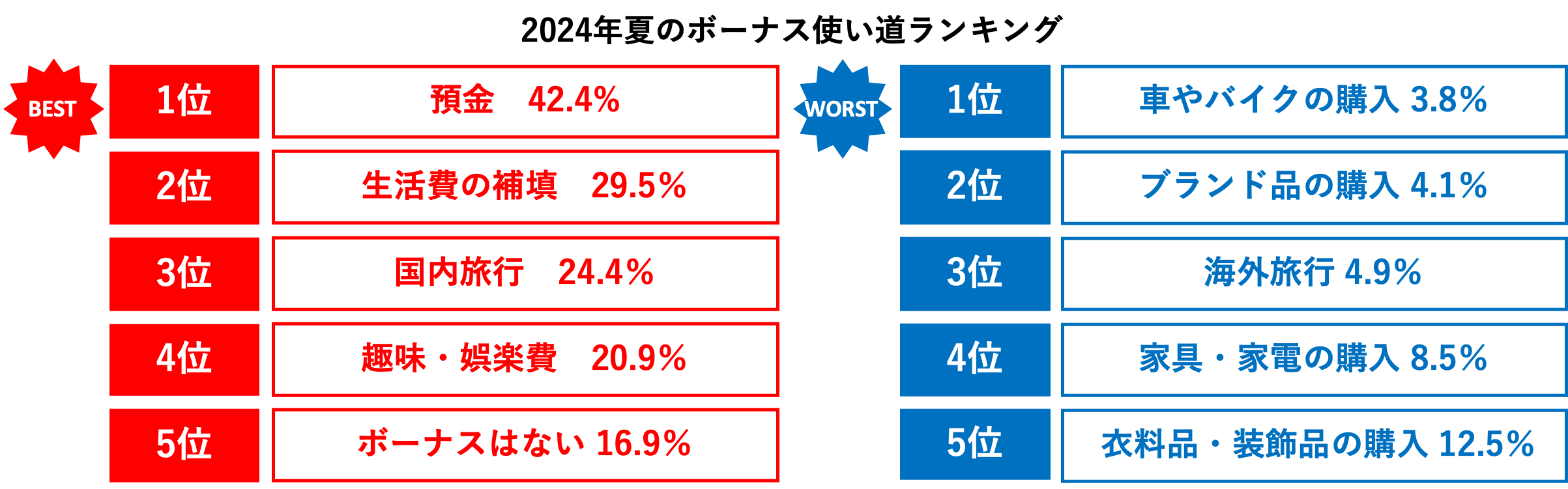 ボーナスの使い道は「預金」が42.4%と最も多く、次いで「生活費の補填(29.5%)」といった結果でした。なかには株式投資・NISAなどの「資産運用(14.6%)」、「ローン等の返済(14.1%)」も一定数おり、将来を見据えて貯蓄・投資や普段の生活費の足しにする傾向にあることがわかります。「車やバイクの購入(3.8%)」、「ブランド品の購入(4.1%)」、「海外旅行(4.9%)」などの高額な支出や贅沢品の購入は控えていることが結果からうかがえます。