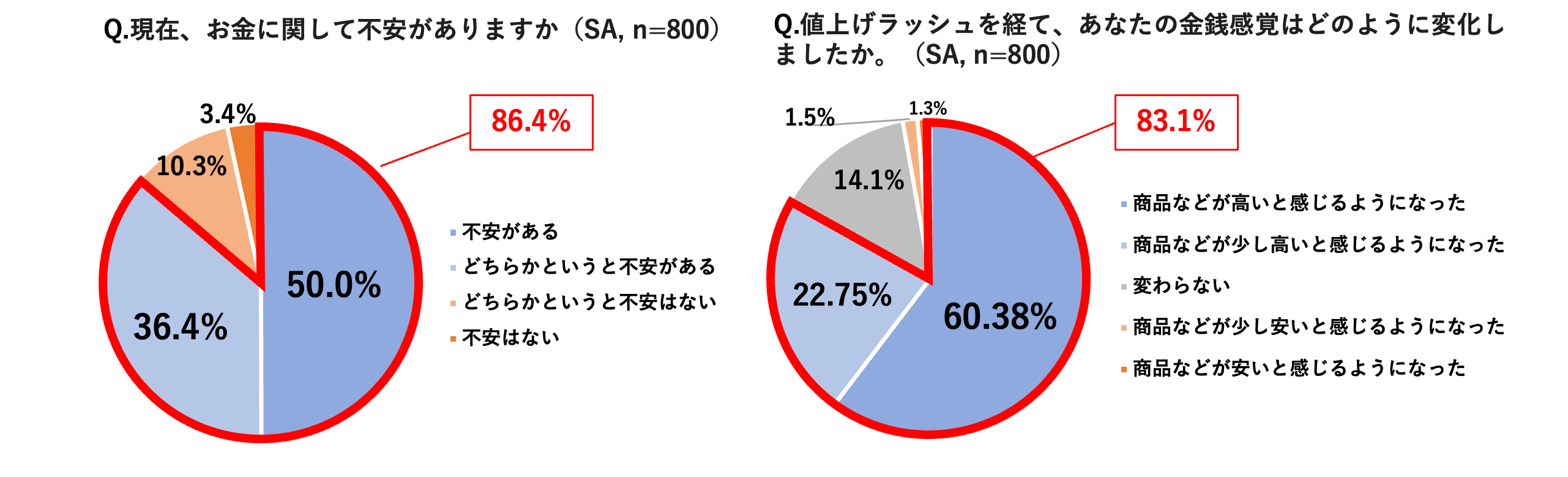 ③ボーナスは過去最高水準を記録した一方、 85%以上がお金に対して不安を感じると回答。不安に感じる理由第一位は「円安や物価高だから」。また8割以上の人が今まで買っていた商品を高いと感じる傾向にあることが判明。
