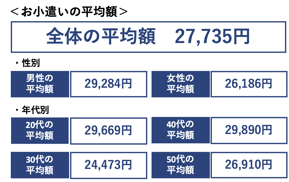 また、お小遣い額の男性平均は29,284円、女性平均は26,186円と、男性の方が若干高い傾向にあります。年代別でみると、20代が29,669円、30代が24,473円、40代が29,890円、50代が26,910円となり、30代のお小遣い額が低い傾向にあることがうかがえます。