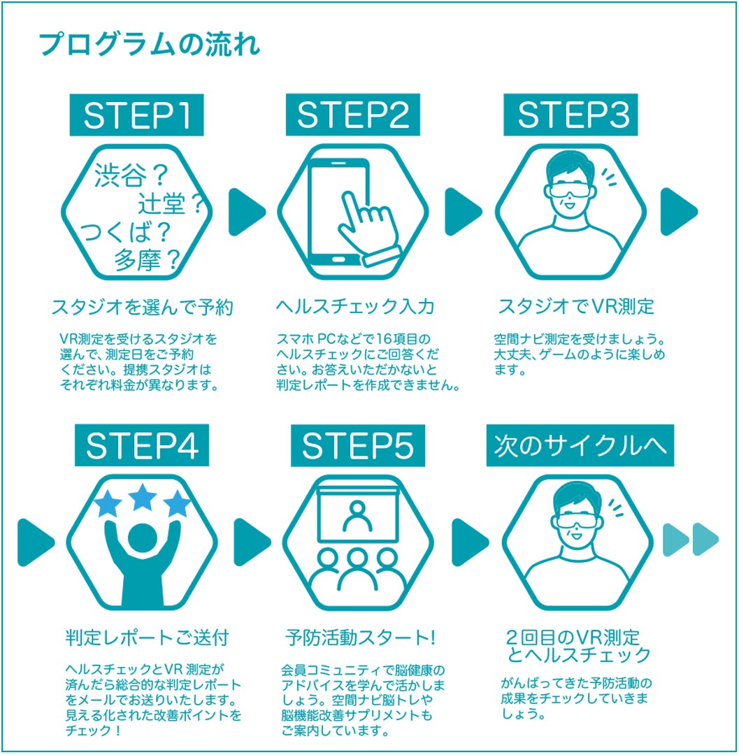 MIGが提供するVRゴーグルによる高島式アルツハイマー病超早期スクリーニング検査プログラムです。Brain100 studioプログラムではVRゴーグルでの空間ナビ測定と、WHOが定めた発症リスク因子などのヘルスチェックに回答いただくと、予防アドバイスを含めた脳健康レポートを提供します。