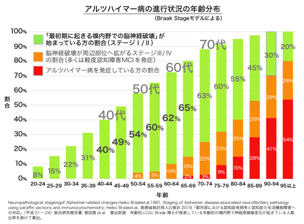 驚くことにアルツハイマー病の「最初期」段階である嗅内野での脳神経細胞の破壊が始まっている方(Braak Stage I)は40代でも約50%近くいます。しかし自覚症状が全くない上に、既存の検査方法では「健常者」と判定されるために、知らない内にそのまま進行しているのが現状です。発症リスク低減活動(予防活動)も最初期から始めると高い効果が期待できることが世界中で実施された疫学的研究からも分かっています。(画像3)