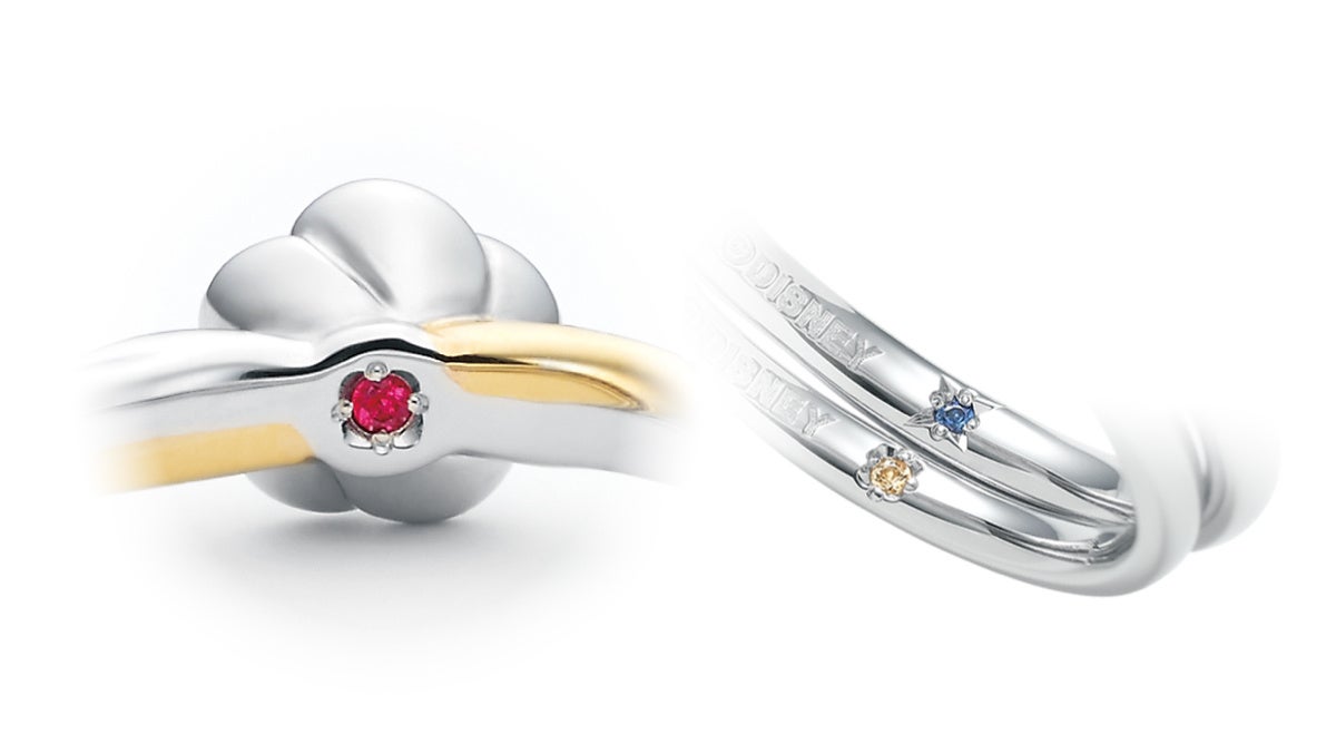 それぞれのリング内側には物語の印象的な色” を表現しています。ベルの〈黄色〉、野獣の〈青〉、魔法のバラの〈赤〉。それぞれがもつイメージカラーとともに、願いを込めた宝石やモチーフをリングの内側に秘めお届けします。