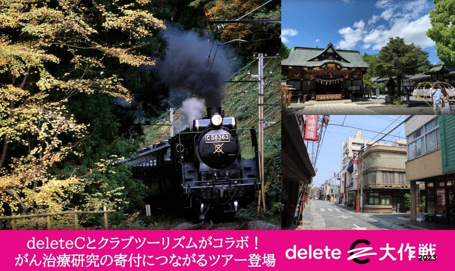 第一弾の日帰りバスツアー「#deleteC大作戦in秩父で乾杯!お酒の聖地・秩父番場通りで飲み食べあるき&『秩父SLパレオエキスプレス』乗車」は、東京・新宿出発の観光バスで、由緒ある「秩父神社」を訪れ、番場通りでの地酒や名物を飲み食べあるき、人気のSLパレオエキスプレスに乗車するなど秩父の魅力を満喫できるプランです。10月末に番場通りで開催されるイベントに合わせて設定し、歩行者天国となったレトロな街並みの中で、アウトドアダイニングが楽しめる特別な体験をご用意しています。本ツアーの旅行代金の一部が、deleteCを通じてがん治療研究の寄付へとつながります。