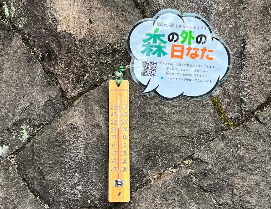 参加者は森と外に設置された温度計を使って気温を実際に測定し、地面に手を近づけたり、風の通りを感じたりしながら、身の回りの環境のちがいを体感します。さらに、測定ポイントにはQRコード付きの看板を設置しており、スマートフォンで読み取ることで、自然の働きに関するワンポイント情報も得られます。自由研究用の「学習シート」も用意しており、調べたことや気づきをその場でまとめることができます。