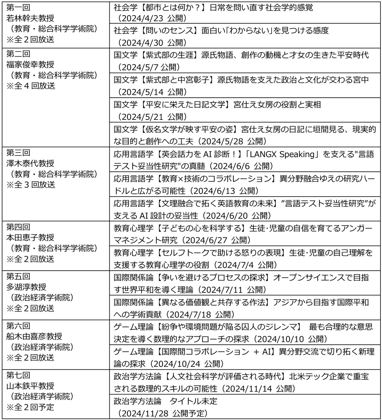 これまでのシリーズ『ゲーム理論:「ゲーム理論」の現在地とこれから/船木由喜彦教授』『国際関係論:国際政治を科学する。理論とデータで導く国際平和への処方箋/多湖淳教授』『教育心理学:子どもの心を科学する! 実践主義を徹底したアンガーマネジメント研究/本田恵子教授』『応用言語学:文理融合で社会実装 言語教育のAI活用を支える言語テスト妥当性研究の真髄/澤木泰代教授』『社会学:世の中の前提を紐解く、社会学的感覚/若林幹夫教授』『紫式部の生きた軌跡・宮廷女房たちが映し出す平安社会の姿/福家俊幸教授』も番組HPより視聴いただけます。