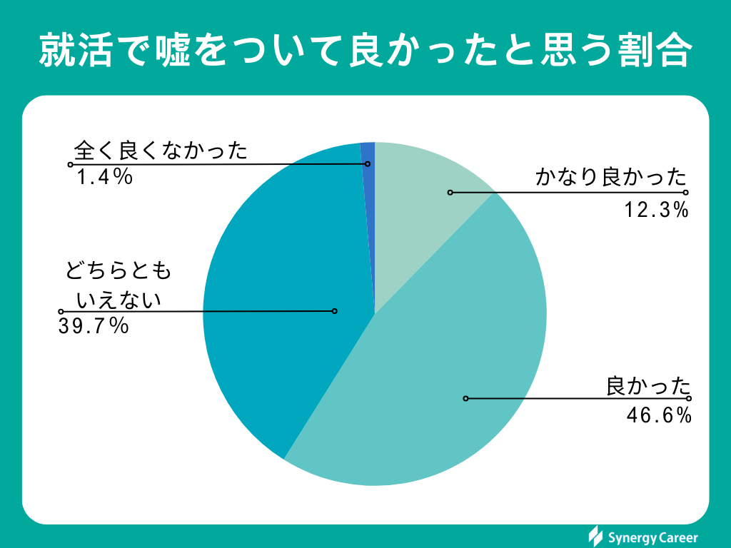 嘘をついて「かなり良かった」「良かった」と感じた就活生は58.9%と多数でした。「良くなかった」の回答率はかなり低いため、就活で嘘をつくことに抵抗感はなく、「当たり前」の感覚に近いと考えられます。