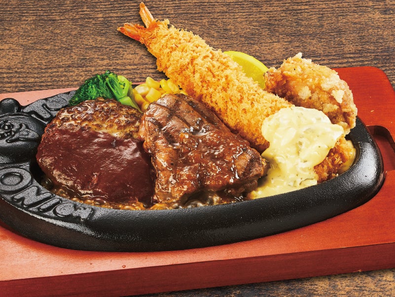 ハンバーグ・ステーキ・エビフライ・唐揚げと子供から大人まで誰もが大好きなメニューだけを集めた、トマオニ初の4連コンボメニューは食べ応え抜群。満足感も4倍に!!食べ盛りの10代~20代の方に特におすすめです。