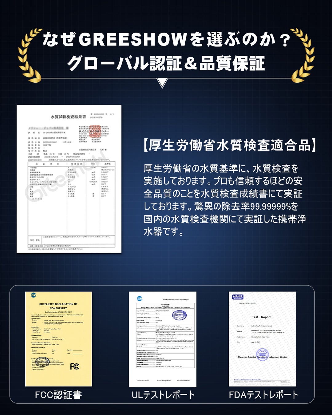 厚生労働省の水質基準に、水質検査を実施しております。プロも信頼するほどの安全品質のことを水質検査成績書にて実証しております。アメリカのNSF水処理、NSF認証素材で、ヨーロッパのLFGBの厳しい食用水の安全基準をクリアした水質であることを実証済みです。細菌、ウィルス、原虫嚢子(のうし)など除去率99.99999%、バクテリア、ウィルス、重金属、プラスチック粒子を取り除き、効果的に水の味を改善します。