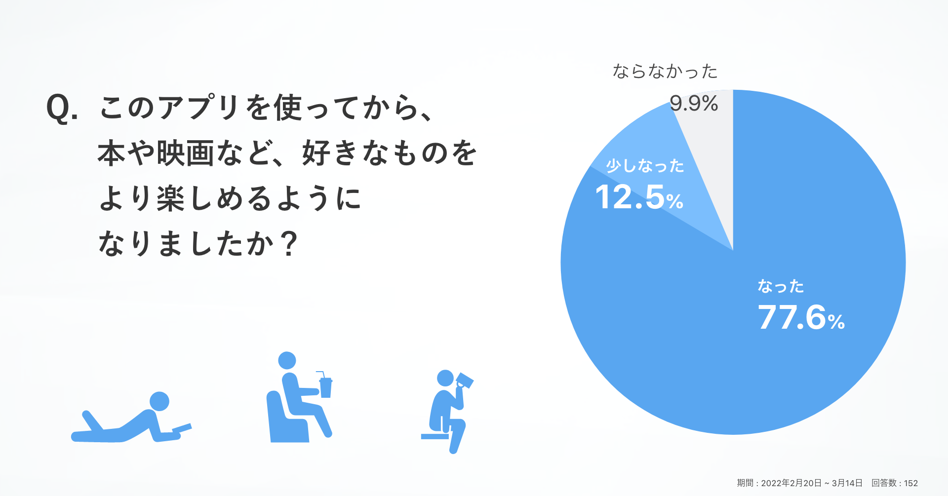 152名の回答が得られ、うち90.1%が「このアプリを使ってから、本や映画など、好きなものをより楽しめるようになりましたか?」の設問に対し、「なった」「少しなった」と回答しました。