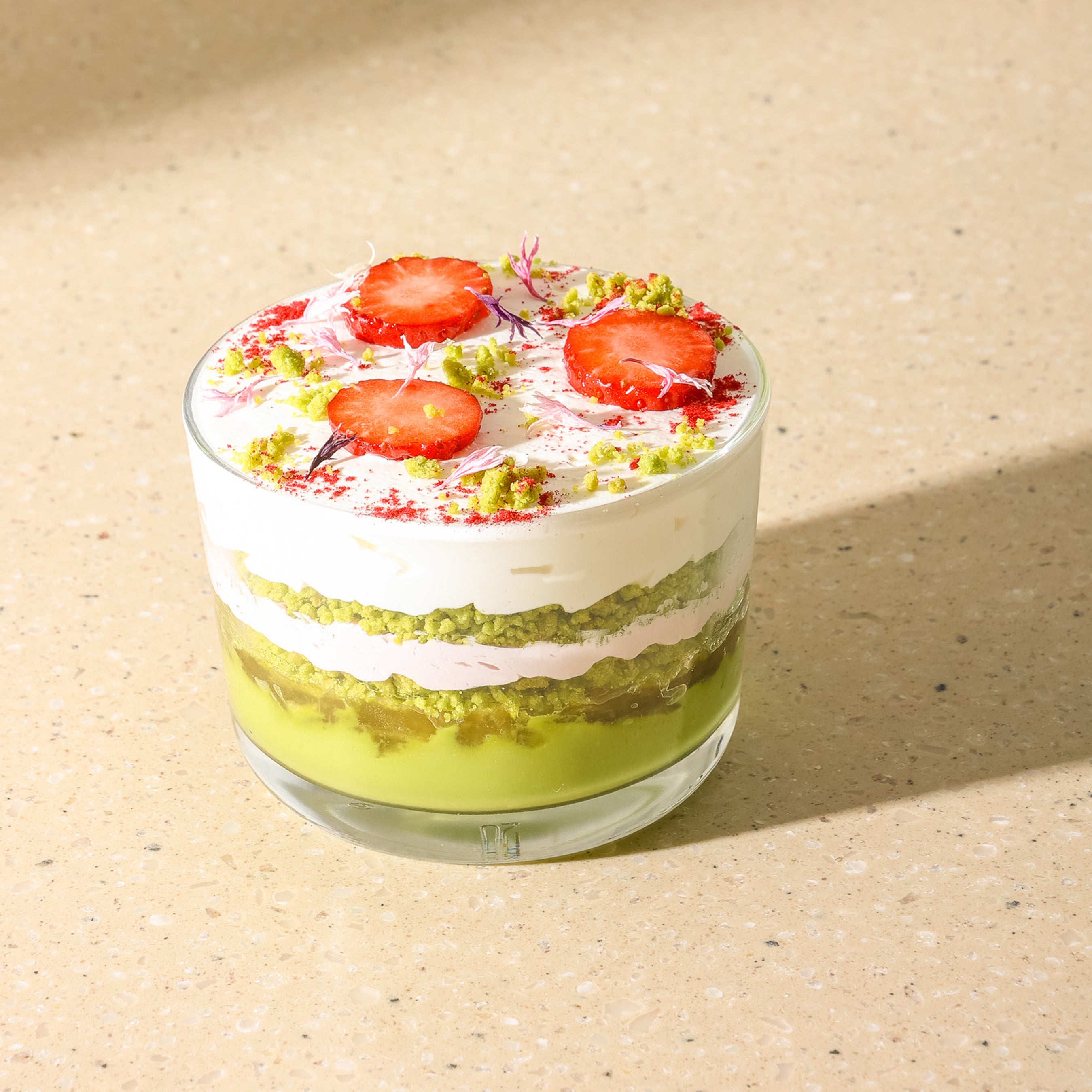 奥深い抹茶ムースに、りんごのみずみずしい甘みと抹茶クランブルの食感を重ねた春らしいトライフル。桜ホイップとマスカルポーネホイップが全体をやさしく包み、ストロベリーとエディブルフラワーで華やかな彩りを。春の訪れを感じさせる一品です。