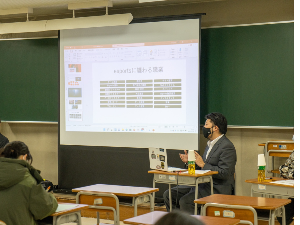 川崎市立高津高校 4年制定時制の3年生に向けた授業で、めずらしい職業・なるのが難しそうな職業として「プロゲーマー」の説明を代表の友利よりお話いたしました。