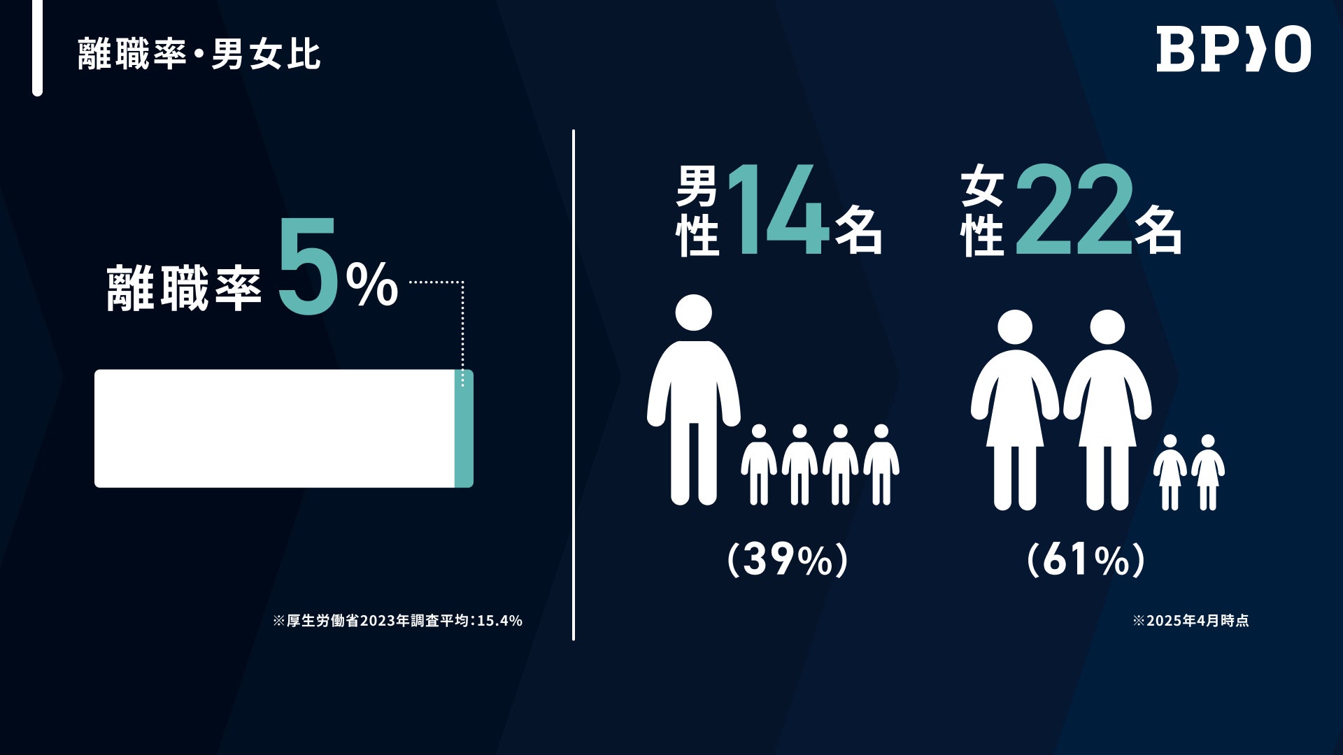 また、社内では様々なバックグラウンドを持つメンバーが集まり、女性が61%を占めるなど多様な人材が活躍しています。さらに社内の離職率は業界平均15.4%(厚生労働省2023年調査)を大きく下回る5%を実現し、安定したサービス提供体制を構築しています。