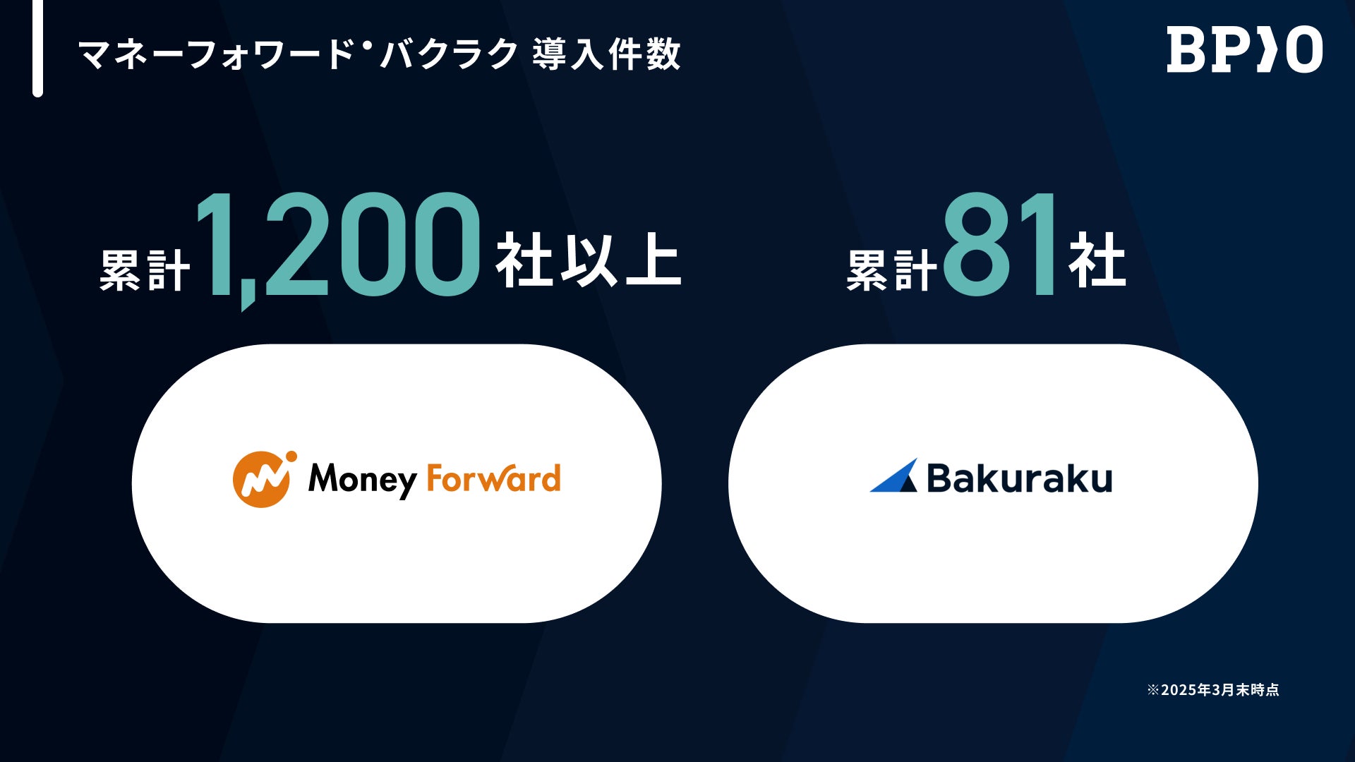 バックオフィスSaaSシステムの「マネーフォワード」シリーズの導入サポートは累計1,200社以上。株式会社LayerXが提供する請求書管理と経費精算に特化したクラウドサービス「バクラク」の導入は81社に達しました(2025年3月末時点)。