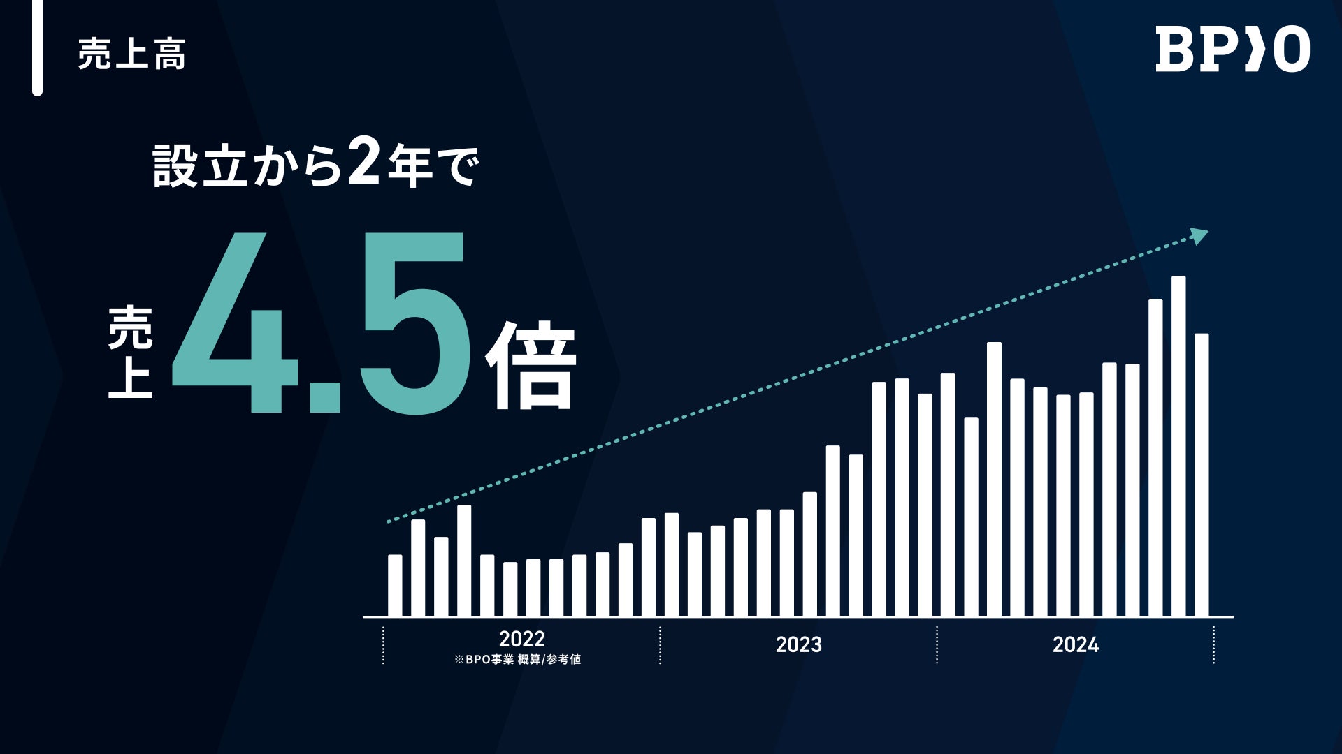 株式会社BPIOは2022年にSEVENRICH Accountingの経理アウトソース事業としてスタートし、2023年4月に「株式会社BPIO」を設立。2025年3月までの2年間で、売上は4.5倍に成長しました。この成長は、日々サービスをご利用いただいているお客様との丁寧な関係づくりの積み重ねによるものと、深く感謝しております。