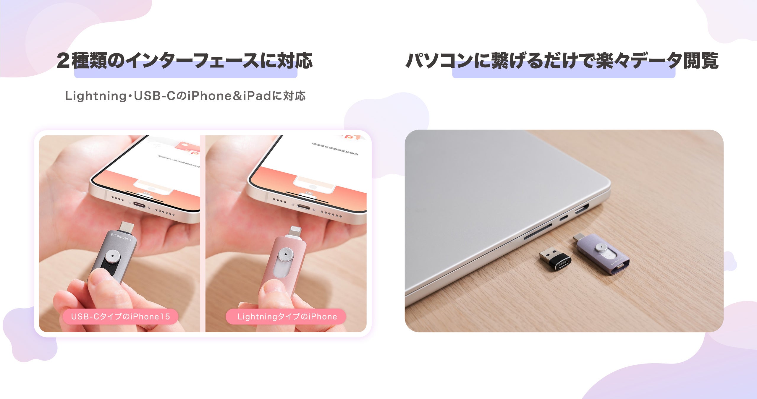 iPhoneに接続するだけで簡単に写真や動画をバックアップ、作成したアルバムフォルダに選んだ写真のみをバックアップする事も可能です。LightningとUSB-C、2種類のコネクタ搭載でiPadやPCなど異なるデバイスへのデータ転送にも便利、iPhone15シリーズにも対応しています。