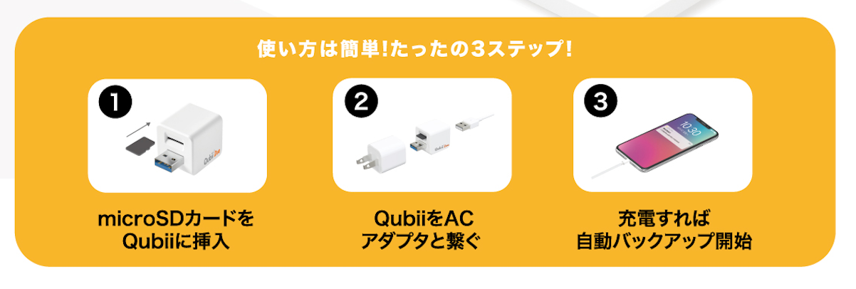 普段使っている充電器とケーブルの間にQubii Duoを接続してスマホを充電すれば自動でバックアップ開始!